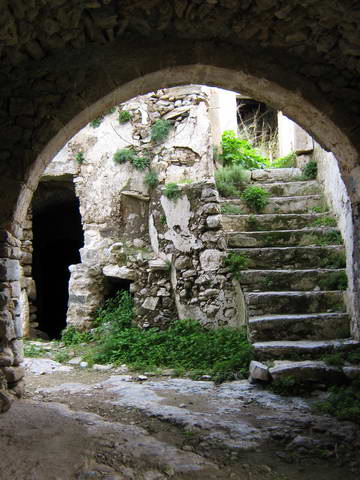 Μέσω ενός καμαροσκεπούς διαβατικού, ο επισκέπτης οδηγείται στους στενούς δρομίσκους και αντικρίζει τις ερειπωμένες και εγκαταλελειμμένες κατοικίες, που συνήθως είναι διώροφες. Ο κάτω όροφος (ισόγειο) αποτελείται από καμαροσκεπείς χώρους, οι οποίοι χρησίμευαν ως αποθήκες ή στάβλοι. Η άνοδος στο ανώγι του οποίου η στέγη κατά κανόνα ήταν επίπεδη, γινόταν με εξωτερική κτιστή κλίμακα.
